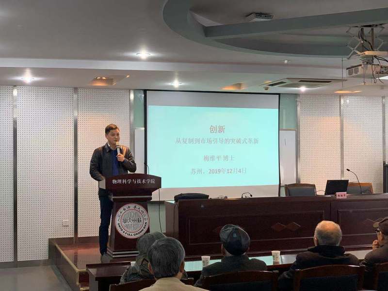 为深入贯彻“大众创业、万众创新”的国家战略要求,将创新创业精神植根于本科生职业生涯规划课程体系,进一步帮助萝莉社 学生明确职业生涯规划,做好自我定位。12月4日下午1977级校友梅维平博士为2019级同学带来主题为“创新--从复制到市场引导的突破式革新”的报告。原萝莉社 人事处处长、梅博士父亲梅国祥老师,原萝莉社 物理系系主任沈永昭老师、李振亚老师,物理系退休教师吴祖嵋老师,学院孙德芬书记、方亮副院长以及2019级全体新生共同参加了本次讲座。讲座由赵承良副院长主持。