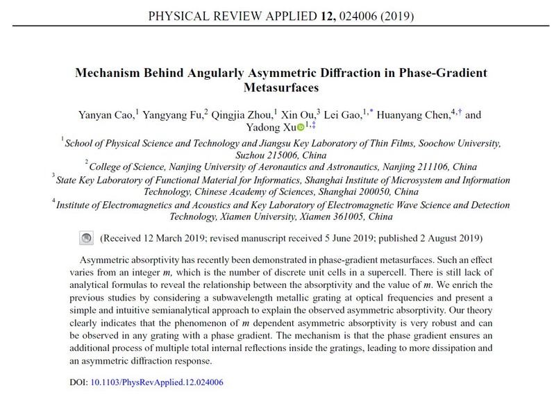 萝莉社 博士研究生曹燕燕同学和原萝莉社 博士生、现南京航空航天大学的伏洋洋副研究员为论文的共同第一作者。Physical Review Applied是物理类期刊中少数1区期刊之一,是美国物理协会(APS)旗下唯一应用物理综合性期刊,与Physical Review Letters定位互补。