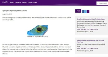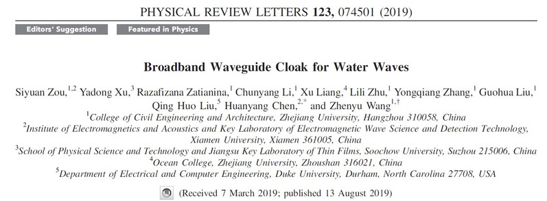 该成果入选PRL封面故事及编辑推荐,并且被APSPhysics以“Hydrodynamic Cloaks”为题亮点报道。Physics World头版头条以“Broadband cloak controls water waves in harbours”为题报道该成果,Science News也以“New cloaking devices could hide objects from water waves and currents”为题做专访报道。