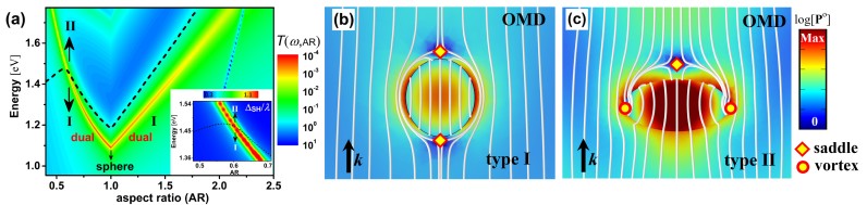 自旋轨道耦合与光的聚焦、散射或成像相关,是光子角动量守恒的体现。许多有趣的现象与自旋轨道相互作用密切相关。研究团队在之前提出的用对偶球纳米颗粒增强光的自旋霍尔位移(Laser & Photonics Reviews 12:1800130 (2018))的基础上,探究颗粒的形态变化对光自旋霍尔位移以及远场散射强度的影响。发现了对具有特定长短轴比值的椭球颗粒,散射强度可以有效地提高一个数量级,同时保持波长量级的自旋霍尔位移。研究团队还发现了一种对偶颗粒轨道动量流线的新模式。这种新模式可以解释近场奇异光学涡旋对远场自旋霍尔位移起源的作用。