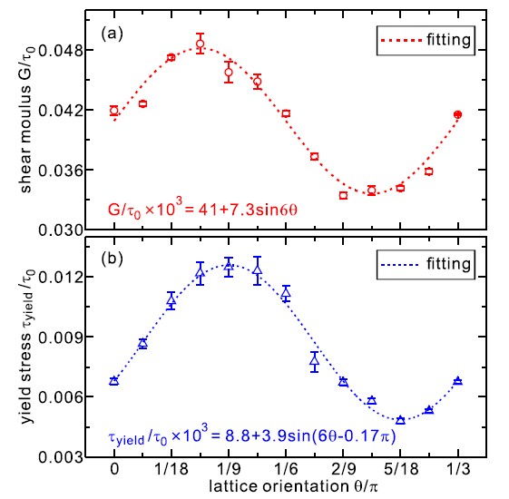 图1 系统剪切模量与屈服应力随晶格取向的变化规律。