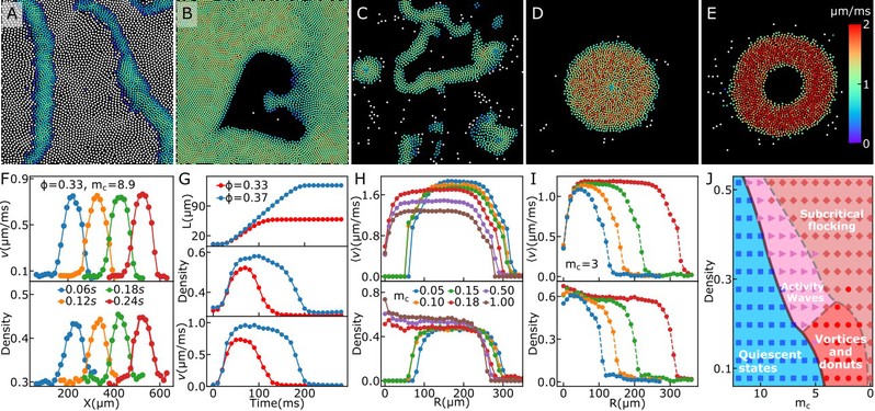 研究人员通过发展粒子-流场耦合模型,并考虑体系的亚临界特性,结合理论分析和模拟详细的刻划了体系在不同条件下的相态行为(如图二),并与大量的实验观测进行了对比。这些结果表明体系中涡旋和激发波的产生不受制于边界和粒子可能的手性。粒子的运动通过介质流体产生相互作用,在亚临界条件下定向激发,协同产生大尺度下的集体行为。
