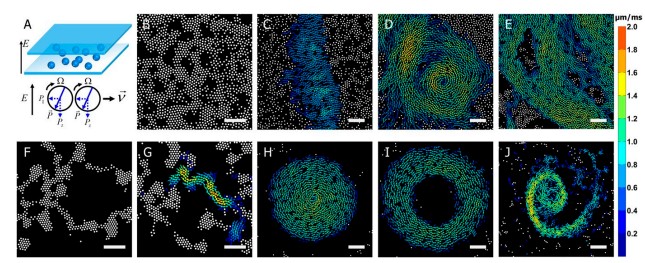 研究采用的是一种被称为Quincke滚珠的微米胶体电介质颗粒。粒子处于弱导电的有机电介质溶液中,在一定强度的电场激发下,可在导电衬底上发生滚动(如图一)。当电场小于临界电场时,孤立的胶体粒子静止不动,但在周围胶体粒子的互助激励下,可形成亚临界条件下的运动,并通过空间“传染”发生集体运动。图一展示了一些实验体系中发现的亚临界集体激发态。