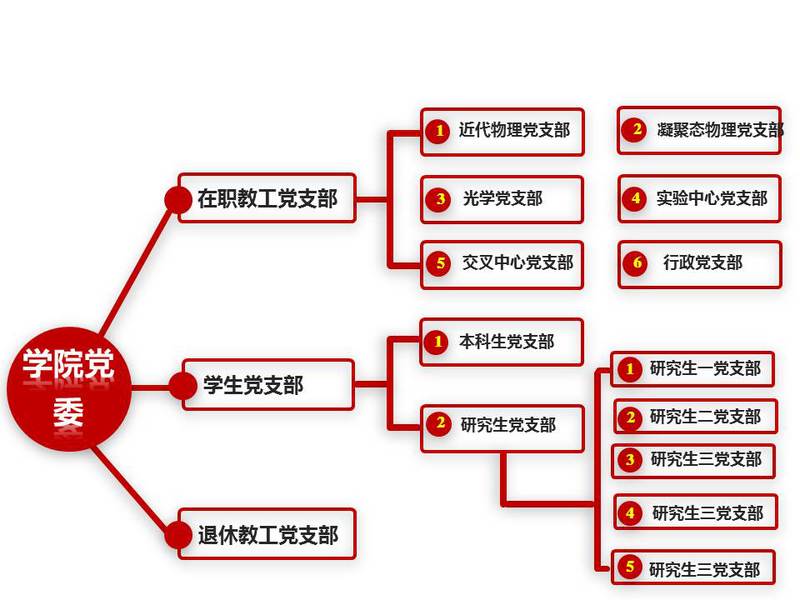 物理学院党委现下设有13个党支部,其中6个在职教工党支部,1个退休教工党支部,5个研究生党支部,1个本科生党支部。