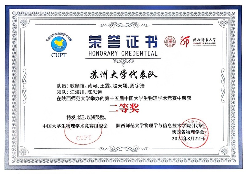2024年8月18日至22日,由中国大学生物理学术竞赛全国组委会主办、陕西师范大学承办的第十五届中国大学生物理学术竞赛(简称CUPT)在陕西西安举行。我校代表队与全国68支队伍齐聚西安,历经三天角逐,最终荣获全国二等奖。CUPT举办至今,已逐渐成为规模最大的国家级大学生物理类学科竞赛,是实践国家创新驱动发展战略纲要和国家教育中长期发展规划纲要的重要大学生创新竞赛活动之一。CUPT赛题的开放性、创新性和前沿性,有效提高学生的自我学习、思维创新以及团队协作等能力。
