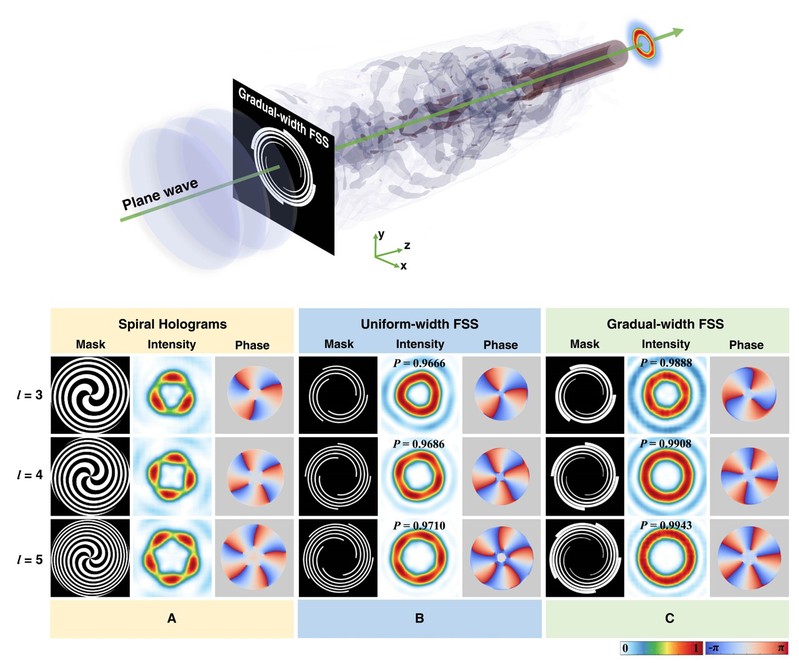 旋涡光束携带轨道角动量,因其具有这一额外的调控自由度,在许多光学领域具有重要的应用价值。因此,如何产生低成本、高质量的旋涡光束成为研究者普遍感兴趣的问题。最近萝莉社 赵承良教授团队结合传统费马螺旋狭缝和波叠加原理,提出了一种宽度渐变的新型费马螺旋狭缝结构,通过入射平面波即可在传输平面产生高质量的光学旋涡。相比于已有的二值化掩模和宽度均匀的费马螺旋线产生技术,该方案产生的旋涡光束质量大幅度提高,在拓扑荷数等于3时,光束纯度可以超过99%。该结构具有高加工容错率,利用激光打印机和透明胶片就可以实现打印,从而获得光束纯度大于98%的涡旋光束,该产生技术有望替代昂贵的微纳光学元件,更加经济和普适。此外宽度渐变的费马螺旋结构产生的旋涡光束具有更大空间范围的焦深,使得其在实际应用如光镊中的容错率更高。文章还揭示了具备这一优势的原因,即渐变宽度提供了特殊的混合态。该工作提出的低成本、高质量光学旋涡产生方法,在光通信、光学微操纵、纳米制造等领域具有重要的应用价值。国务院学位委员会学科评议组成员、国家级人才袁小聪教授还为此项工作点评,予以高度评价,认为该研究团队提出的低成本、高质量光学旋涡产生方法,在光通信、光学微操纵、纳米制造等领域具有重要的应用价值。