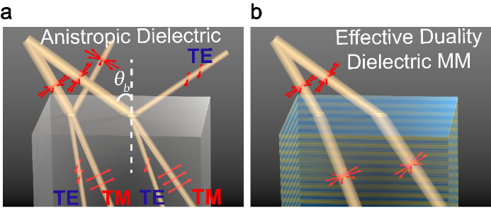 在真空中,麦克斯韦方程组满足电磁自对偶对称性的基本特性。然而,物质的存在会导致电响应与磁响应不再平衡,从而从根本上破坏了这种对称性,产生了一系列深远的影响。例如,能够将不同偏振的光分离的经典布儒斯特效应和双折射效应,都可以看成为是材料中的电磁自对偶对称性被破坏所导致的后果。如果能够在材料中恢复这种电磁自对偶对称性,就有可能实现一类电磁特性与真空类似的新材料,消除对偏振的选择性。