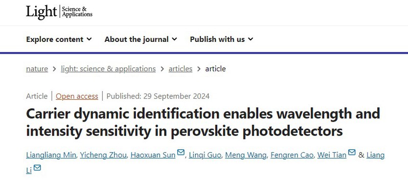 相关工作以“Carrier Dynamic Identification Enables Wavelength and Intensity Sensitivity in Perovskite Photodetectors”为题发表在Light: Science & Applications学术期刊上。物理学院博士研究生闵亮亮、硕士研究生周易承为文章的共同第一作者,李亮教授、田维教授和孙浩轩副教授为文章的共同通讯作者。该项研究得到了国家自然科学基金、江苏省自然科学基金以及江苏省高等学校重点学科建设项目(PAPD)资助。