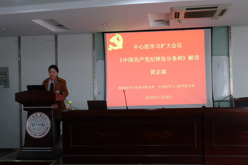1128日下午,在物理科技楼409会议室,学院党委召开了中心组学习扩大会议,邀请校纪委副书记、监察处处长黄志斌给学院全体党员做了关于《中国共产党纪律处分条例》解读的专题报告,学院党委书记孙德芬主持了会议,全体师生党员共同参加了此次中心组学习。