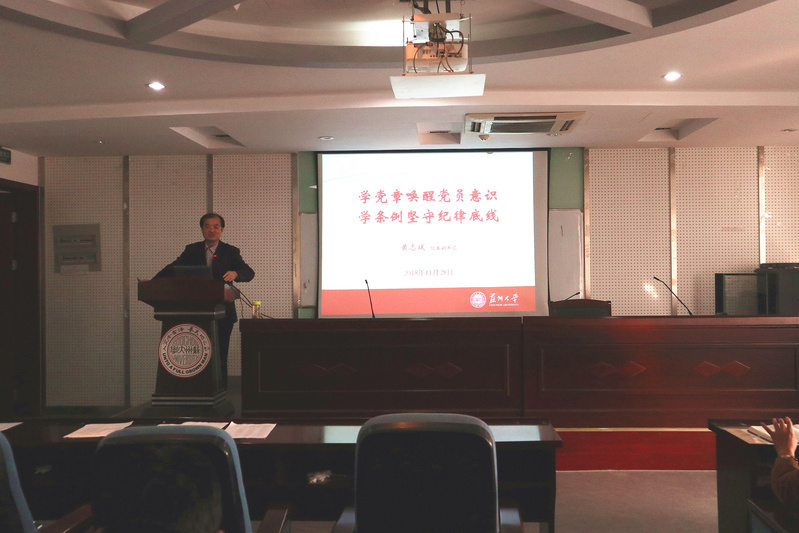 黄志斌书记通过“学党章唤醒党员意识”、“学条例坚守纪律底线”、“守纪律坚守底线 纪检监察远离你”等三个专题讲座,结合实际案例,详细解读了新修订的《中国共产党纪律处分条例》,并结合发生在学校的典型案例,作风建设自查自纠查出的问题以及校园微腐败整治等工作,对每一个党员同志提出了几点要求,要求全体党员树立作风建设永远在路上的观点;要强化作风无小事,反腐无盲区的理念;要恪守凡事按政策办,凡事按规矩走,凡事按制度来的纪律,严守党的政治、组织、廉洁、群众、工作、生活等各项纪律。最后,孙书记做了总结发言,感谢黄书记给学院党员同志做的精彩报告,同时要求学院每一个党员要提高思想认识,增强学习贯彻的自觉性和坚定性,严格按照《条例》强化纪律约束,筑牢思想防线;要深入学习领会,坚持把学习领会《条例》作为当前一项重要政治任务抓紧抓实,自觉把讲政治、懂规矩、守纪律作为我们的正身之本,政治上讲忠诚、组织上讲服从、行动上讲纪律;要强化贯彻执行,坚持高标准、严要求,真正让制度、纪律成为带电的高压线, 严守政治纪律、组织纪律、工作纪律、廉政纪律,严格以铁的纪律来规范言行。牢记立德树人使命,用实际行动回答习近平总书记提出的为谁培养人,培养什么样的人,怎样培养人的问题。