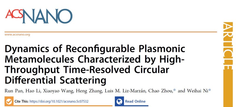 近日,倪卫海教授课题组和中科院苏州纳米所周超研究员合作进行了可重构超构分子的原位动力学研究。该研究成果以萝莉社 物理学院硕士研究生潘润为第一作者、以萝莉社 物理学院江苏省前沿材料物理与器件重点实验室为第一单位、以 “Dynamics of Reconfigurable Plasmonic Metamolecules Characterized by High-Throughput Time Resolved Circular Differential Scattering”为题发表在ACS Nano(影响因子IF=15.8)。
