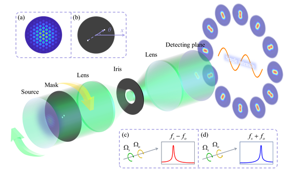 激光多普勒效应以其非接触、快速测量、宽带频率响应、高空间分辨率和远程测量等突出优点,在天体观测、精密计量、激光遥感等领域得到了广泛应用。近十年来,基于涡旋光束拓扑荷与角速度定量关系的旋转多普勒效应引起了极大关注。然而,旋转多普勒效应用于角速度测量时,需将光源对准物体的旋转轴,否则将造成频移信号的展宽甚至淹没。因此,如何实现无需对准的角速度测量成为研究者感兴趣的课题。
