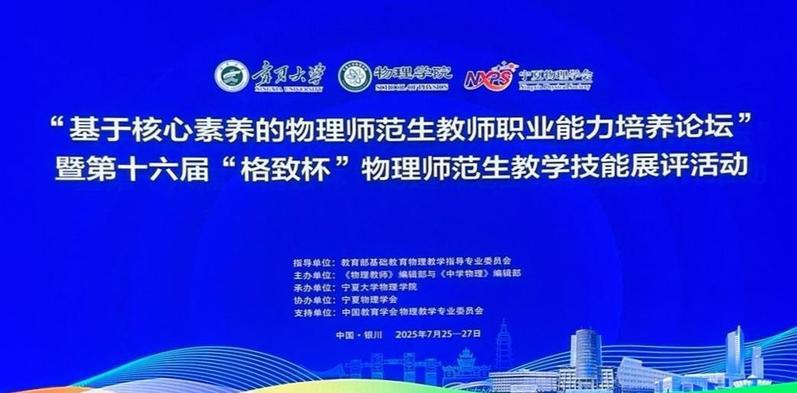 7月25日至27日,由教育部基础教育物理教学指导专业委员会指导、中国教育学会物理教学专业委员会支持,《物理教师》编辑部和《中学物理》编辑部联合主办,宁夏大学承办,宁夏物理协会协办的“基于核心素养的物理师范生教师职业能力培养论坛”暨第十六届“格致杯”物理师范生教学技能展评活动在宁夏大学成功举办。
