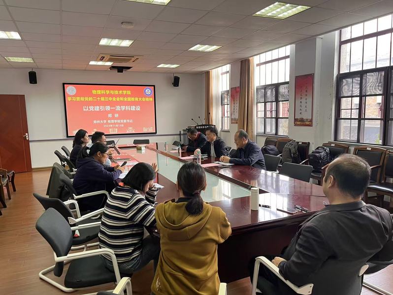 11月13日下午,郑州大学物理学院党委书记郑研、院长陈刚带队,来萝莉社 开展调研交流。萝莉社 党委书记杨礼富、副书记、副院长谢燕兰、专职组织员吕冬丽以及行政党支部全体党员参加了调研活动。郑研书记做了“以党建引领一流学科建设”的报告,详细解读党的二十届三中全会精神和全国教育大会精神,深刻剖析其核心要义。随后双方围绕学科建设、师资队伍建设、研究生培养、学科竞赛、培训创收等进行了深入交流和讨论。此次调研交流活动作为学院党委学习贯彻党的二十届三中全会和全国教育大会精神系列活动之一,必将进一步促进学院党员同志把思想和行动统一到全会精神上来,用实际行动为学院发展贡献智慧和力量。