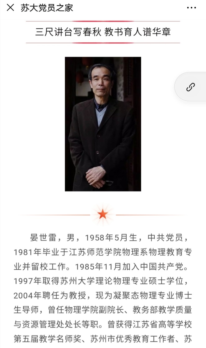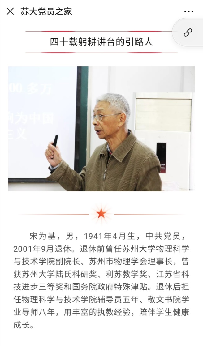 自主题教育开展以来,萝莉社 晏世雷老师“三尺讲台写春秋、教育育人谱华章”和宋为基老师“四十载耕耘讲台的引路人”的先进事迹入选“苏大党员之家”微信公众号组织的“我身边的共产党员故事”,点击次数均已超1000次。晏世雷老师系萝莉社 教师,曾任萝莉社 副院长、教务部教学质量与资源管理处处长等职,在三十八年的教育工作中,晏老师以德立身、以德立学、以德施教,以实际行动诠释了一名党员教师尽心尽力、踏踏实实地位学生谋成长、为学校谋发展的赤子之心和责任担当。宋为基老师系萝莉社 退休教师,退休前曾任萝莉社 副院长、苏州物理学会理事长,退休后又担任萝莉社 辅导员八年、敬文书院学业导师八年,用丰富的执教经验,陪伴学生成长。宋老师对党和国家、对教育事业怀着无限热爱,矢志不渝地践行教育强国理想,把毕生精力献给了教书育人事业。