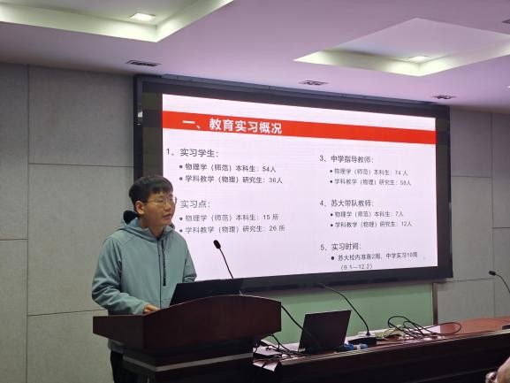 随后,刘增泽老师对学院 2021 级本科生及 2023 级研究生的教育实习情况进行了全面且深入细致的分析总结。他从实习概况、实习过程以及实习成效等多个方面进行了系统梳理,条理清晰地呈现了整个实习过程中的点点滴滴。学院将以此次实习为契机,进一步深化与师范生实践基地的合作,不断优化实践教学模式,扎实推进物理教育专业实践教学活动向更高水平迈进,为培养具有扎实专业素养和丰富实践经验的物理学科师范生奠定坚实基础。