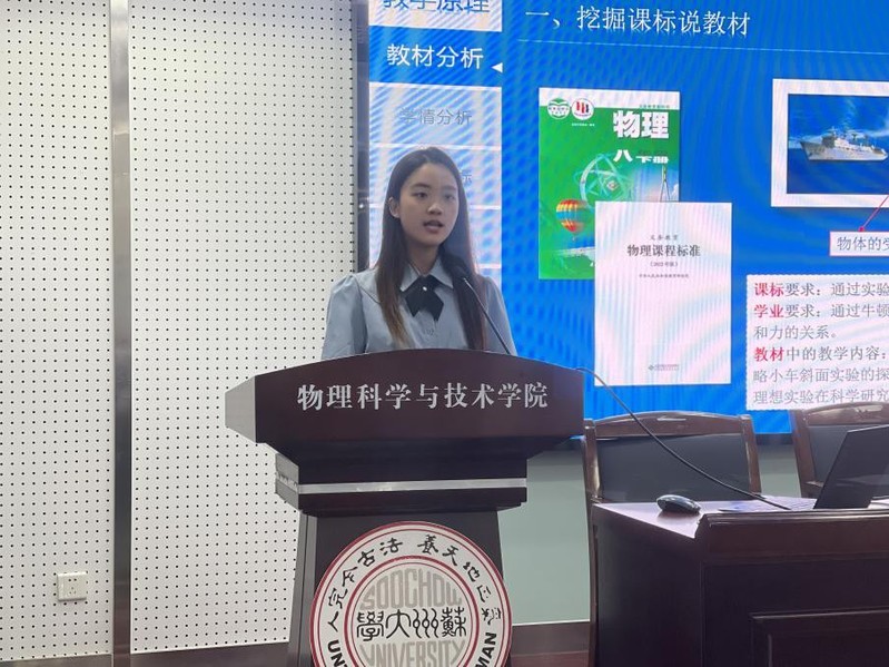 最后,郭永坤老师对学院师范生在第十四届“格致杯”物理师范生教学技能展评活动中的表现进行了回顾, 萝莉社 18名参赛学子表现优异,共荣获教学技能展示一等奖4项、二等奖4项;教具展示一等奖4项、二等奖5项;优秀论文展示特等奖2项、一等奖2项、二等奖3项、三等奖2项。随后的获奖作品展示环节中,本科生李逸青、王佳骏,研究生王曦、项姿睿和张亚文带来了精彩生动的教学片段展示,体现了扎实的物理专业素养。