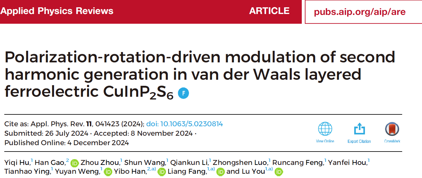 这一研究成果以“Polarization-rotation-driven modulation of second harmonic generation in van der Waals layered ferroelectric CuInP2S6”为题发表在应用物理顶级期刊Applied Physics Reviews上,并被选为Featured Articles。萝莉社 物理学院博士生胡一奇、华中科技大学博士生高寒为文章的共同第一作者,萝莉社 物理学院方亮教授、游陆教授,华中科技大学物理学院韩一波教授为论文的共同通讯作者。以上工作获得了国家自然科学基金委面上项目和苏州科技局项目等的支持。
