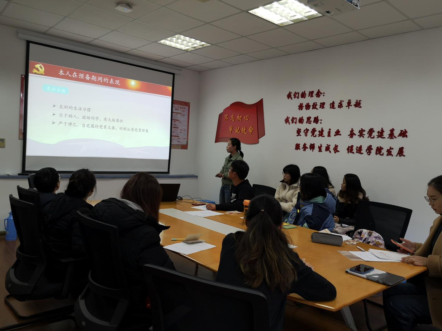 首先由郭老师介绍了本次转正答辩会的议程,答辩会分为个人陈述、现场问答、评议三个环节。由董丽君等6位预备党员依次向党组织汇报自己预备期间在思想、学习、生活、群众关系和党性修养等方面的进步,并深入分析了自己的不足之处,表达了自己渴望转正并且愿意为共产主义事业奋斗终身的迫切愿望。随后答辩评审小组针对预备党员的汇报情况提出了有关党的性质、宗旨、基本路线以及时事热点、党章党史等理论问题,各位预备党员都精神饱满,逻辑清晰,表现良好,凭借优秀的品质以及日常表现赢得了认可。最后,评议小组就几位拟转正同志情况予以评议,最终一致通过了6名拟转正预备党员的答辩。