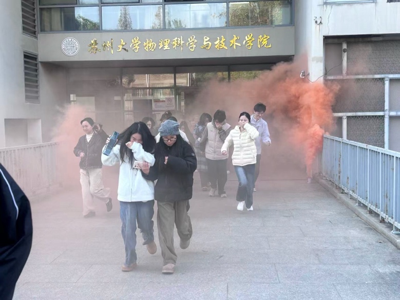在理论学习的基础上,学院联合光电科学与工程学院、能源学院,于11月26日在物理科技楼组织开展了2025下半年度消防应急疏散演练。演练模拟大楼内突发火灾并产生浓烟的场景,警报响起后,楼内师生在校保卫处消防科老师的现场指挥下,迅速采取湿毛巾捂口鼻,弯腰低姿等防护措施,沿指定疏散路线快速、有序撤离至安全集结区域。疏散完成后,师生在消防科老师的专业指导下,认真参加了灭火器实操灭火训练,切实掌握初起火灾扑救技能,应对紧急情况的实战处置能力得到有效提升。