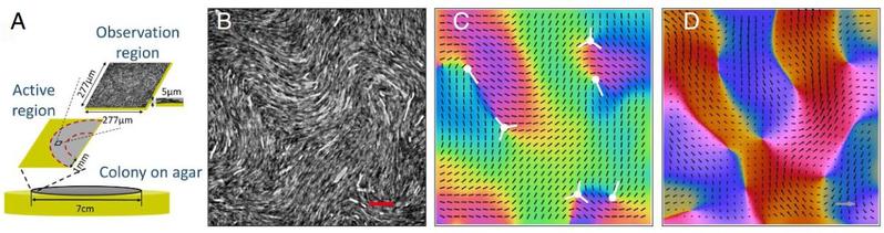 在该研究工作中,研究人员利用粘质沙雷氏杆菌(Serratia marcescens)菌落实现可控的活性物质体系。他们通过加入头孢抗生素来控制细菌的长度,通过荧光标定来示踪细菌,从而不仅可以控制细菌体系的结构和动力学,并且可以实现高质量的实时的数据采集。更为有意思的是,该实验体系成功实现了理论研究中非常关注的活性向列相体系。在获得大量数据的基础上,研究人员发展了一套普适性的粒子模型从而可以利用实验数据定量化模型的参数空间,在实验和模型层次首次实现定量匹配的研究工作。大规模的数值研究表明,可以通过表征和匹配体系的空间关联长度,以及两类拓扑缺陷的动力学来匹配模型中所有的参数。利用这样优化的参数,研究人员可以从模型上重现实验中观测到的时空动力学。他们的精确测量和模拟显示拓扑缺陷在大时空尺度的生灭和自发迁移,并且与体系的自激发流场之间存在强烈的耦合关系。