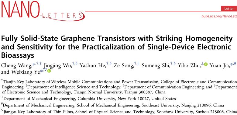 近日,萝莉社 的青年教师叶巍翔与东南大学、天津师范大学青年教师贾原、王程合作在二维材料石墨烯晶体管电子器件领域取得创新性研究成果。该成果以“Fully solid-state graphene transistors with striking homogeneity and sensitivity for the practicalization of single-device electronic bioassays”为题在物理电子学领域的顶级期刊Nano Letters(纳米快报)上在线发表研究论文(DOI: 10.1021/acs.nanolett.9b03528)。