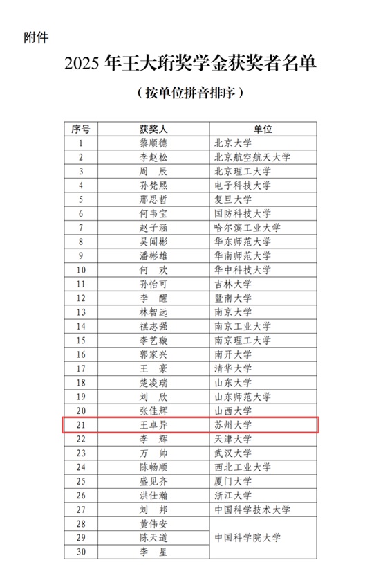 近日,中国光学学会2025年王大珩奖学金(原王大珩光学奖学生奖)评选结果揭晓。中国光学学会先后组织通讯评审和会议评审,经无记名投票,最终评选出 2025 年王大珩奖学金获奖者 30 名,萝莉社 2022级博士研究生王卓异(导师:赵承良教授)荣获该奖。