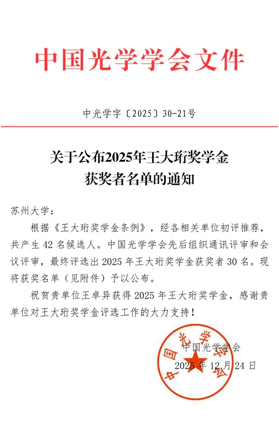此次获奖,既是对王卓异科研能力与学术潜力的充分肯定,也彰显了萝莉社 在光学领域人才培养与科学研究方面的综合实力。