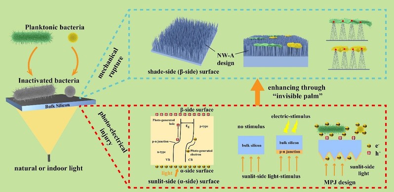 针对这一问题,近日萝莉社 邹帅副研究员-苏晓东教授课题组首次提出了一种基于硅基微纳结构的光电协同作用高效抗菌策略,使得硅基底阴面在自然光、室内环境光或阴暗潮湿的环境下都能实现持续、高效的抗菌效果。具体地说,将硅基底阴面设计为具有高自发杀菌活性的改进型纳米线结构,对“阴面”的细菌造成巨大的力学破坏作用;阳面则设计为微米金字塔与PN相结合的复合结构(MPJ),受光阳面在光激发下产生电子-空穴对,通过PN结转换为可作用到“阴面”的电刺激信号,从而对“阴面”的细菌产生电损伤作用。这种“阴面”和“阳面”协同作用的设计显著增强了阴面的抗菌活性。研究结果表明,在“阳面”受自然光或室内光照情况下,“阴面”的临床常见细菌(如铜绿假单胞菌)和多重耐药细菌(如肺炎克雷伯菌、肠球菌)的存活率减少了几乎100%。这项研究为不易消杀的物体阴面提供了一种高效的抗菌策略,具有触发难度低、成本低、工作条件温和且易满足、广谱抗菌活性强等优势,能有效降低阴面表面细菌感染的风险。本项工作具有重要的理论研究和实际应用价值。