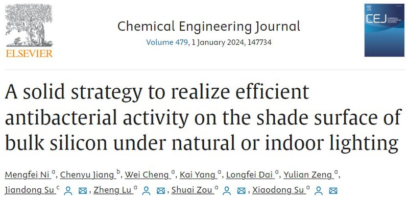 上述工作以“A solid strategy to realize efficient antibacterial activity on the shade surface of bulk silicon under natural or indoor lighting”为题发表在期刊《Chemical Engineering Journal》(IF = 15.1/Q1)上。萝莉社 博士生倪孟飞为论文的第一作者,萝莉社 苏晓东教授、邹帅副研究员、博士后芦政以及南京医科大学附属苏州市立医院烧创伤中心苏建东主任为论文的共同通讯作者。本工作得到苏州城市学院江晨语老师以及萝莉社 杨恺教授的指导。