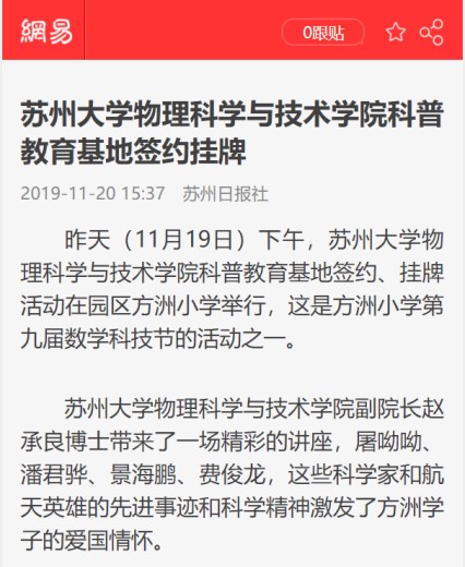 四是共建一批科学奖精神和科普教育基地。在苏州市各中小学共建一批科学家精神宣讲基地,先后与苏州立达中学、吴江程开甲小学、苏州工业园区方洲小学、苏州胥江中心小学、吴江乔芮幼儿园等学校开展基地共建活动。