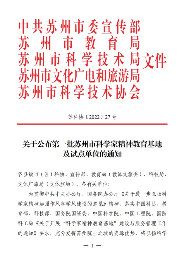 近日,首批苏州市科学家精神教育基地名单公布,萝莉社 科学家精神教育基地集群成为全市首批10家建设单位。萝莉社 “两弹一艇”科学家精神教育基地作为萝莉社 科学家精神教育基地集群的三家单位之一成功入选。