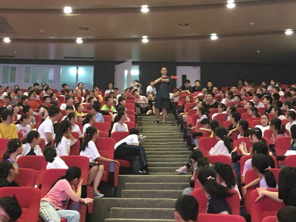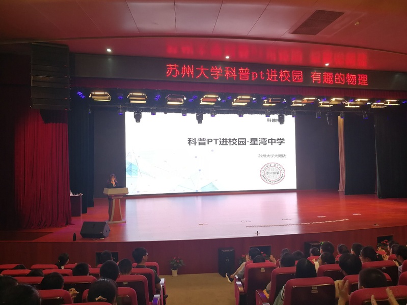 星湾中学费老师首先做了开篇致辞,对前来科普的翁雨燕博士及其PT团队致以感谢,并简单的介绍了本次宣讲的主题:为在校的初一学生们科普物理知识,领略物理风采,体验实验乐趣,对初二的物理形成初步印象,打破学生学物理难的常规思维。