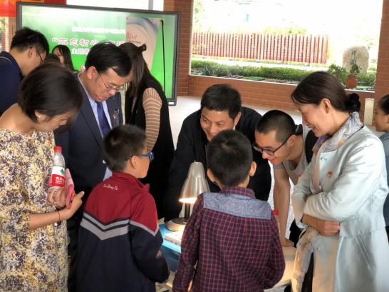参观结束后,学院领导、教师党员和学生党员作为志愿者和学院“科学商店”的科普志愿者一起在一楼大厅给程开甲小学的学生们进行科普服务,大家用通俗易懂的语言解释了记忆金属、辉光球、电磁炮、超声波喷泉、人体电池、手摇发电机、电磁铁、太阳能电池板等妙趣横生的物理现象的原理,让参加活动的同学们体验了一场趣味、生动、绚丽的科学盛会。
