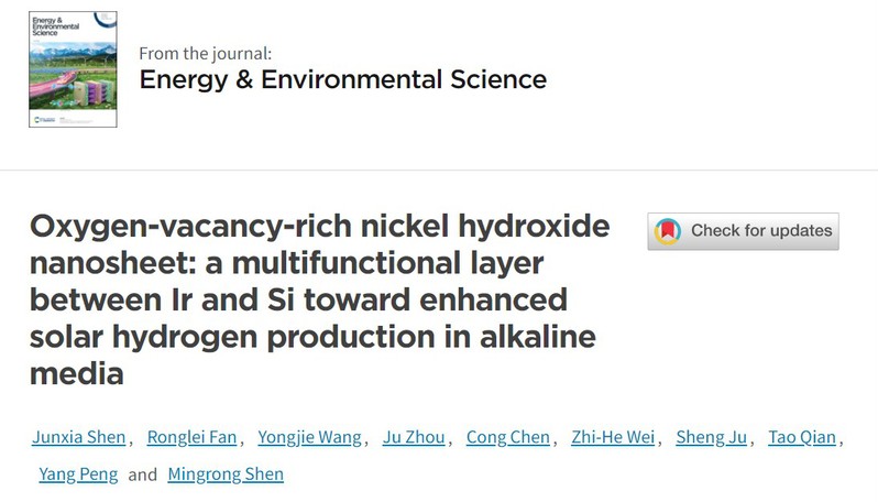该研究成果以《Oxygen-vacancy-rich nickel hydroxide nanosheet: a multifunctional layer between Ir and Si toward enhanced solar hydrogen production in alkaline media》为题,于2022年5月25日发表在Energy& Environmental Science上。我校萝莉社 范荣磊博士、雎胜教授和沈明荣教授为共同通讯作者;我校萝莉社 硕士生沈君霞为论文的第一作者。该工作得到了国家自然科学基金、江苏省高等学校学科优先发展计划项目资助。
