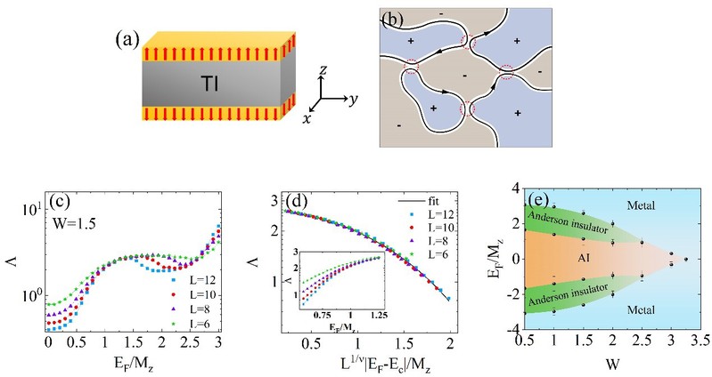 图:(a) 轴子绝缘体的简单示意图;(b) 区域边界上的手性边缘态互相散射形成导电通道;(c) 无量纲局域化长度作为费米能的函数;(d) 单参数标度的数值拟合;(e) 无序轴子绝缘体的相图。