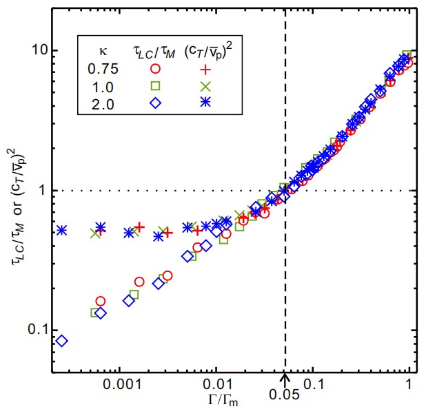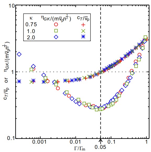 该研究主要利用分子动力学方法模拟大量不同实验参数下二维尘埃等离子体中大量尘埃颗粒详尽的运动,由此计算系统瞬时横波声速,颗粒平均速率,以及系统剪切黏度等一系列物理量随温度变化的规律。研究结果显示,按照该论文提出的约化方法,在不同实验参数下,二维尘埃等离子体液体的无量纲黏度随均归一化耦合参数的变化规律满足普适的标度律,颗粒系统的瞬时横波声速和颗粒平均速率的比值也满足普适的标度律,如图1所示。更有意义的是,当系统瞬时横波声速等于颗粒平均速率时,此时系统的黏度正好处于最小值。这一结果揭示了黏度随耦合参数的变化的转变机制来自于系统的动力学机制转变。当系统瞬时横波声速小于颗粒平均速率时,此时系统的动力学机制由单颗粒动力学行为主导,系统的动量输运主要来源于颗粒碰撞过程,因此随着温度升高而黏度增加,类似于气体行为。然而,当瞬时横波声速大于颗粒平均速率时,即由颗粒间合作动力学行为主导时,随着温度降低,颗粒间相互作用增强,所以黏度增加,是典型的液体行为。