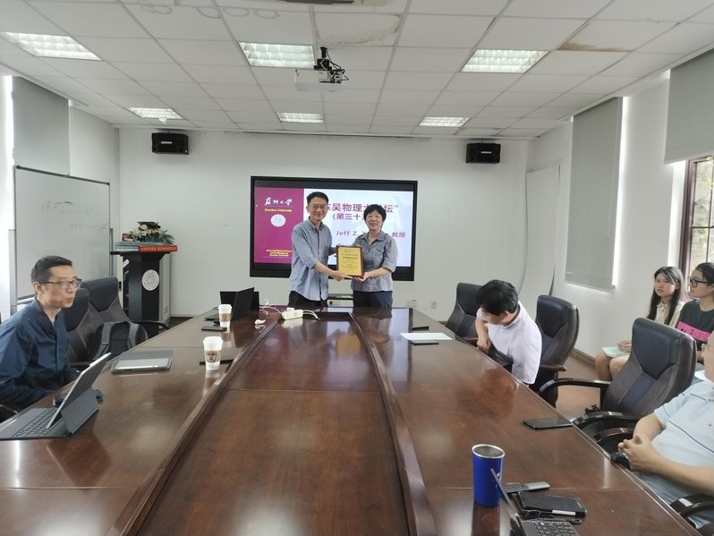 9月5日下午,陈征宇教授担任了物理学院第三十三期“东吴物理大讲坛”嘉宾,并做了有关机器学习及其在软物质体系中应用方面的学术报告。活动由学院副院长赵承良主持,并向陈征宇教授介绍了萝莉社 的历史、沿革和苏大萝莉社 现有情况及发展现状。吴雪梅院长出席了活动,并为陈征宇教授颁发了“东吴物理大讲坛”荣誉牌匾。