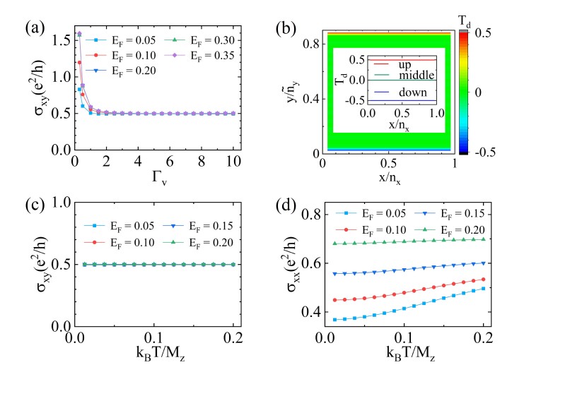 题注:图(a)霍尔电导随退相干强度Гv变化曲线。图(b)Td空间分布,Td用于描述半量子化手性通道。