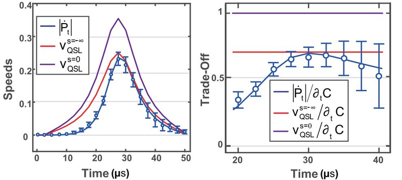 图(左):实际演化速度与两种量子速度极限的对比。(右):在Landau-Zener模型的能级免交叉时间窗口内,实际的量子速度-功耗权衡关系与理论上的量子速度-功耗权衡关系上界的对比。
