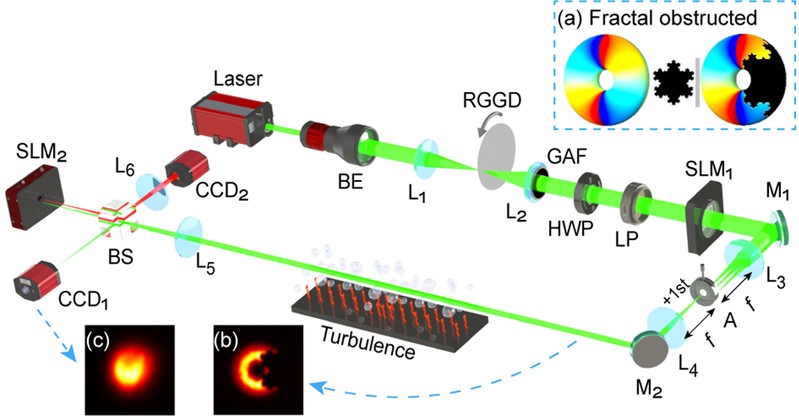 图1. 被遮挡的部分相干涡旋光束在湍流中传输和测量的光路图。(a)表示科赫雪花分形结构遮挡的涡旋光束的示意图,(b)表示源平面的光强分布,(c)表示焦平面的光强分布。