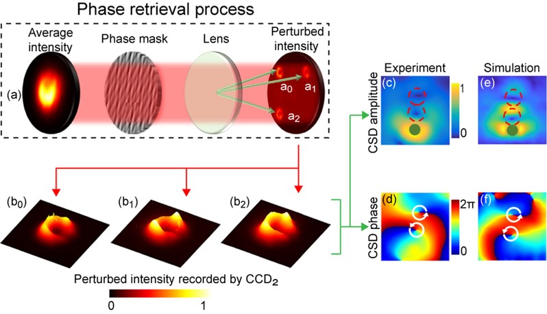 在如图1所示的光路图中,该团队利用空间光调制器加载了被科赫雪花分形结构遮挡的涡旋光束的全息图。实验中利用旋转散射体来调控光束的相干度,使用电热板来产生实验室中的热湍流。在实验的最后部分,为了实验上测量受到扰动和遮挡的部分相干涡旋光束的轨道角动量的大小和符号,利用一个高分辨率的空间光调制器来同时加载三次不同的相位扰动,进而通过全息算法来恢复待测光束的交叉谱密度函数。