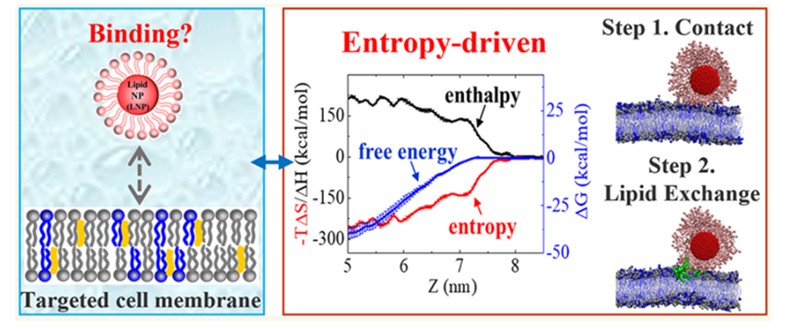 杨恺课题组利用分子模拟技术,系统地研究了脂质纳米颗粒与不同种类细胞膜之间的相互作用情况。研究发现脂质纳米颗粒与膜之间的结合采用一种独特的两步机制:颗粒与膜的接触以及之后的脂质交换。更重要的是,研究表明这一结合过程是一个熵驱动的过程。这也使得脂质纳米颗粒能够有效区分具有不同脂质成分的膜。这些结果有助于理解脂质纳米颗粒与膜相互作用的微观分子机制,并为设计膜靶向的脂质纳米药物载体提供了有效的熵调控策略。