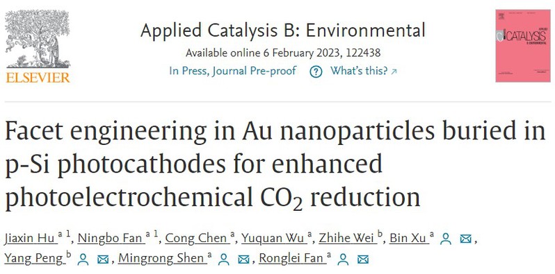 近日,萝莉社 范荣磊副研究员(共同通讯作者)、沈明荣教授(共同通讯作者)、许彬教授(共同第一作者)、能源学院彭扬教授(共同通讯作者)等团队在构建光电化学Si光阴极用于高活性和高选择性的CO2还原方面取得了创新性成果。相关工作的第一作者为硕士研究生胡嘉鑫和博士研究生范宁波,以萝莉社 为第一单位,以“Facet engineering in Au nanoparticles buried in p-Si photocathodes for enhanced photoelectrochemical CO2 reduction”为题发表在Applied Catalysis B: Environmental(2022年影响因子为24.319)上。